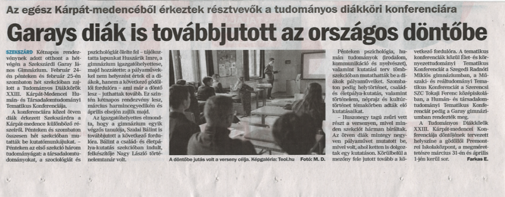 Két napos rendezvénynek adott otthont a hétvégén a Szekszárdi Garay János Gimnázium. Február 24-én pénteken és február 25-én szombaton hét szekcióban zajlott a Tudományos Diákkörök XXIII. Kárpát-Medencei Humán- és Társadalomtudományi Tematikus Konferenciája. Tovább (teol.hu)